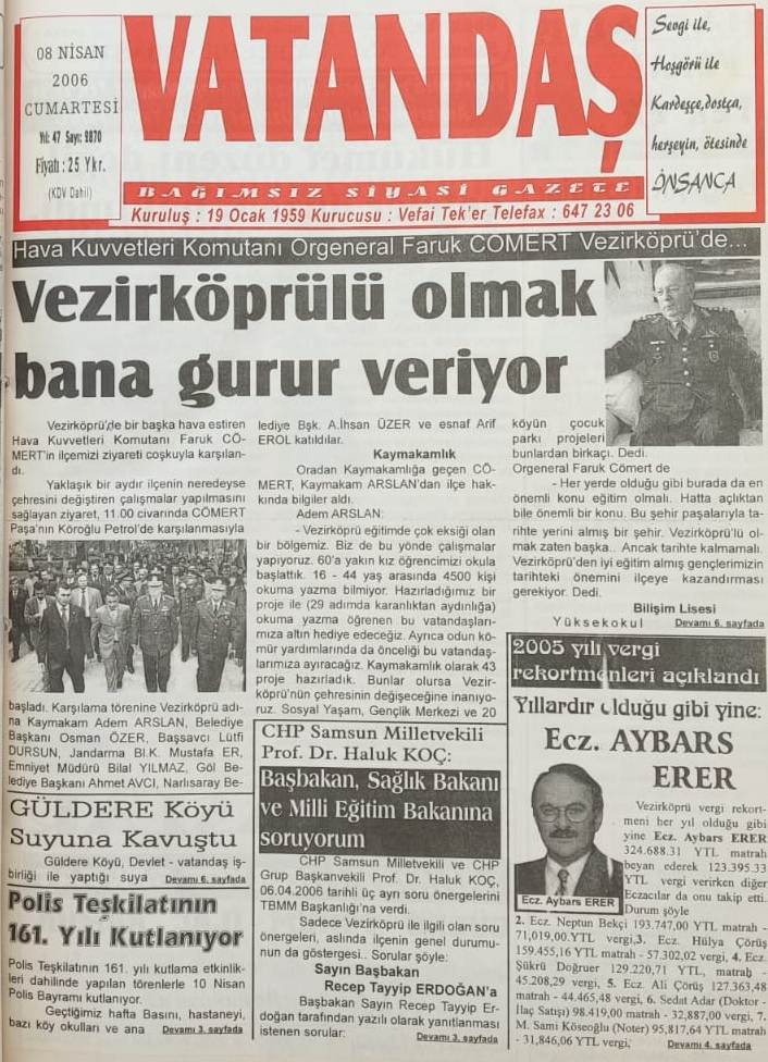 Vezirköprü vergi rekortmeni her yıl olduğu gibi bu senede yine Eczacı Aybars Erer, 324.688.31 YTL’lik matrahı beyan ederek 123.395.33 YTL vergi verirken diğer eczacılarda onu takip etti. Durum şöyle:
