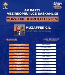 AK Parti Vezirköprü İlçe Başkanlığına seçilen Muzaffer Çil başkanlığına oluşturulan yönetim kurulunun ardından AK Parti İcra Kurulunu da yapılandırılarak kamuoyuna ilan etti.