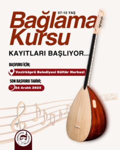 Vezirköprü Belediyesi tarafından, 07–15 yaş aralığındaki çocuklara yönelik bağlama kursu açıldı. Kültürel değerlerin gelecek nesillere aktarılması ve çocukların sanatsal gelişimlerine katkı sağlanması amacıyla düzenlenen kurs için kayıtlar başladı.