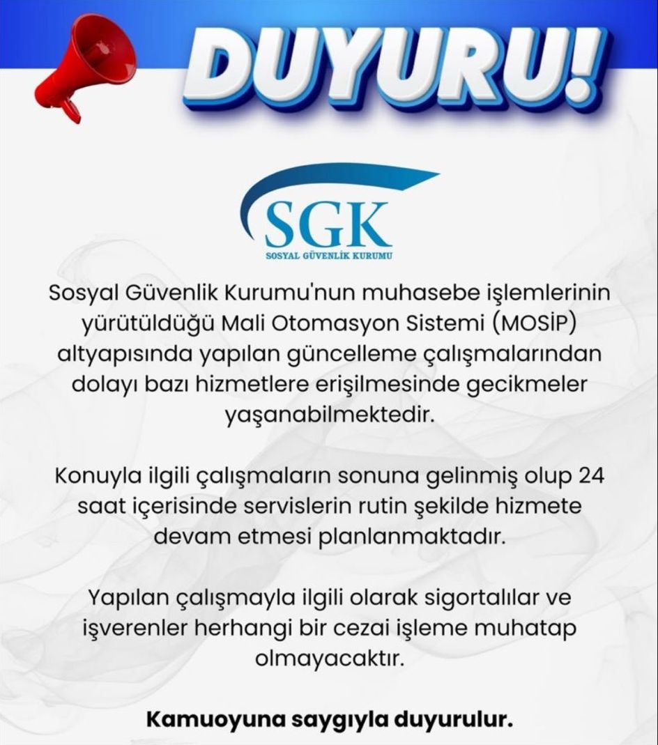 Sosyal Güvenlik Kurumu Mali Otomasyon Sisitemi (MOSİP) ‘te yapılan güncelleme çalışmaları kapsamında sigortalılar ve işverenler için bilgilendirme açıklaması yaptı.