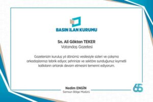 Merhum Vefai amcanın en değerli emaneti olan kıymetli gazetemiz VATANDAŞ’ın 67. kuruluş yıldönümünü kutluyor, Göktan Teker nezdinde tüm çalışma arkadaşlarımıza başarılı bir yayın hayatı diliyorum. Saygılarımla.” mesajıyla;